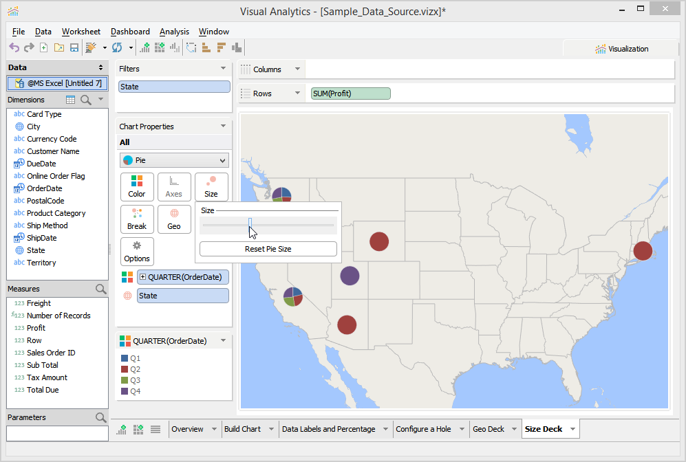 In the sample data source, we have changed the YEAR(OrderDate) to QUARTER(OrderDate). You will notice that Visualization has moved the QUARTER(OrderDate) Dimension to the Color Deck but retained the SUM(Profit) Measure in the Rows Deck. You will also notice that Size Deck is disabled. You can use this deck when you plot a symbol map via Geo Deck.