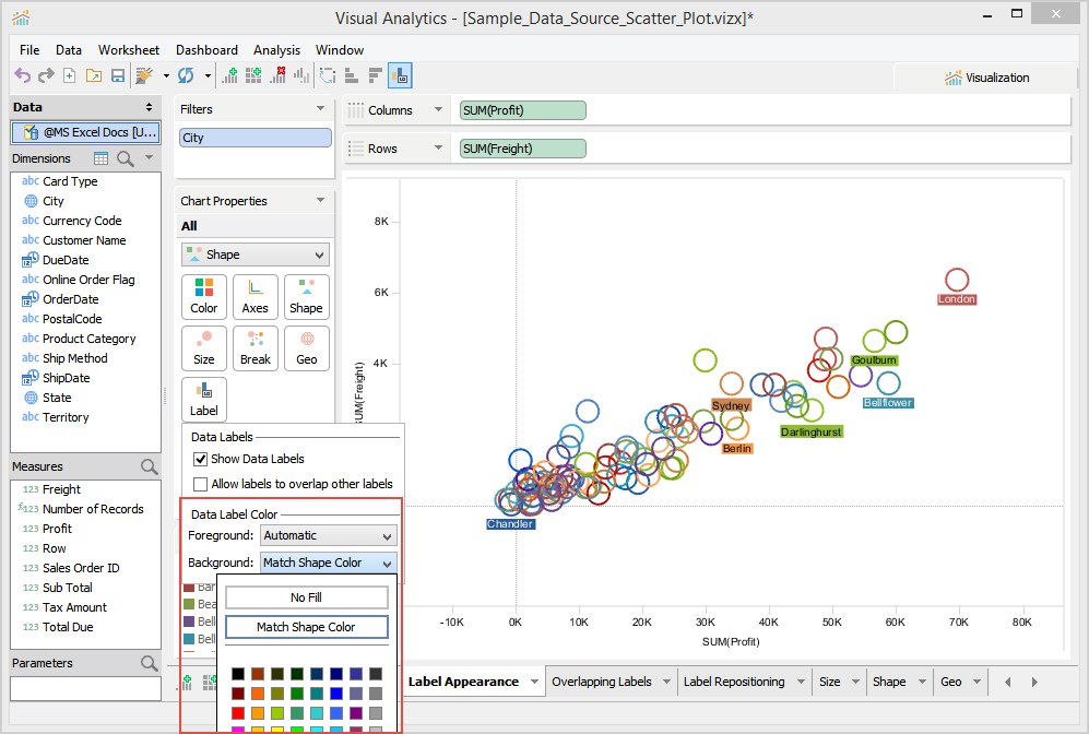 You will notice that Visualization moved Tax Amount to the Size Deck and ShipDate and Proft to the Rows Deck and Freight to the Column Deck. We have moved ShipDate to the Color Deck so that each year is displayed in a different color.