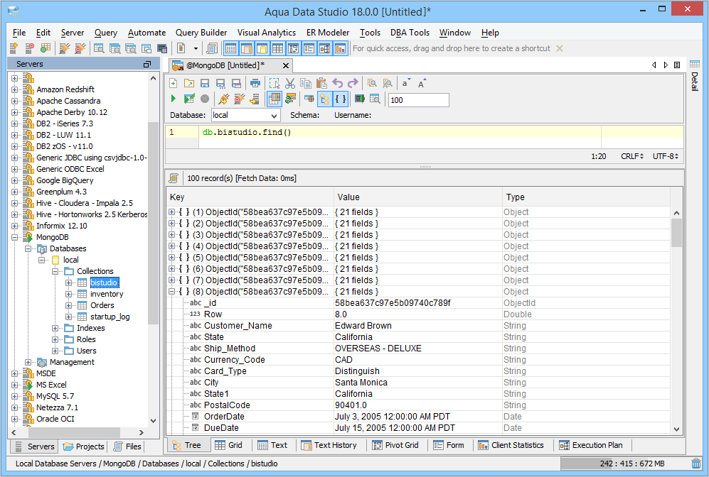 The MongoJS Query Analyzer is another powerful tool in Aqua Data Studio which can execute JavaScript commands against one of the most widely adopted NoSQL database management systems. The JavaScript statements and queries normally run within a MongoDB shell command line interface can be typed within the MongoJS Query Analyzer and executed (CTRL + E). The MongoJS Query Analyzer allows you to view the results in a tree hierarchy, grid results and as text results. We've brought all of our easy-to-use and feature rich Query Analyzer functionality to MongoJS Query Analyzer including statement autocompletion and syntax highlighting. The MongoJS Pretty Print JSON is another new feature which allows you to display the JSON result in an easy to read format.