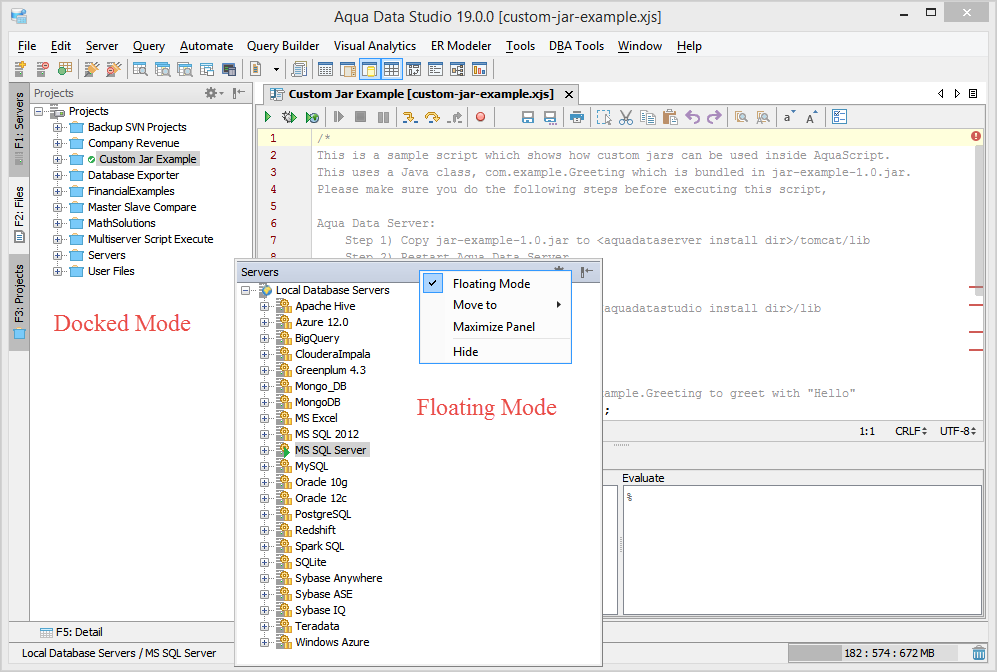 In floating mode, panels are detached from Aqua Data Studio’s main window and displayed as a separate, free-floating window. A floating panel can be moved around anywhere on the screen and is always on top of the editor area. Initially, all panels are in the fixed mode which means they are part of the main Aqua Data Studio window. To switch between the floating and fixed mode, turn the Floating Mode on and off.