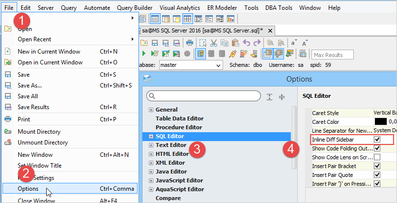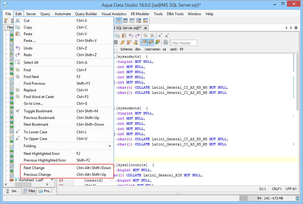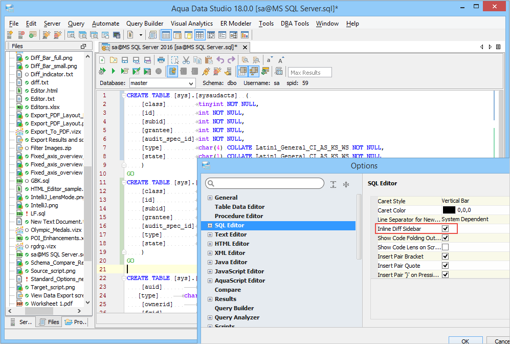 When you modify a file in a version controlled repository, Aqua Data Studio displays inline diff indicators on the Annotation bar. The inline diff indicator automatically indicates the differences between the edited file and its corresponding file in the repository using a different color for each action; a green diff indicator () signifies addition and a blue diff bar indicator (