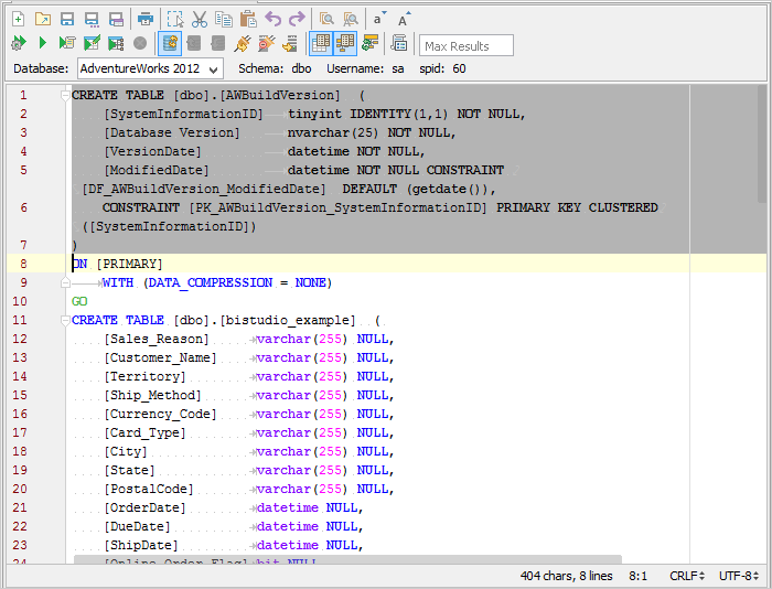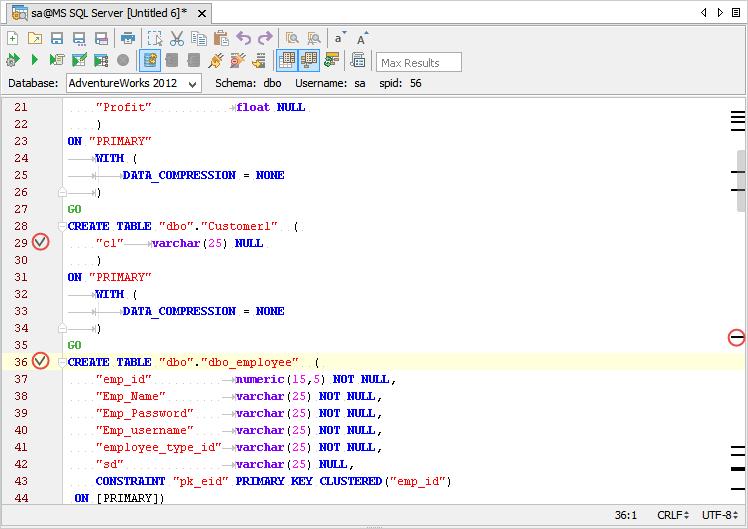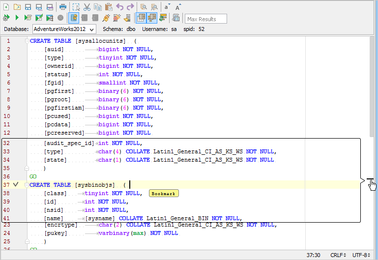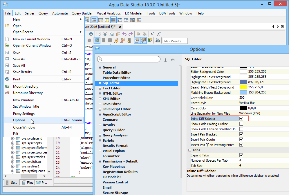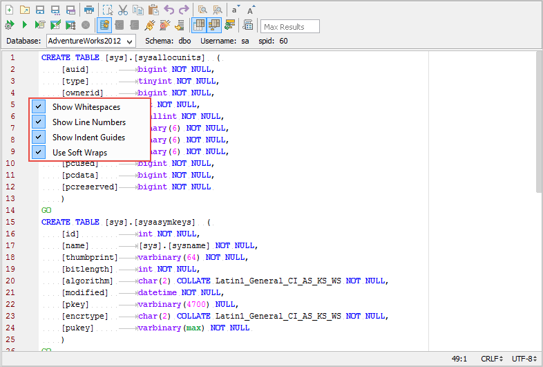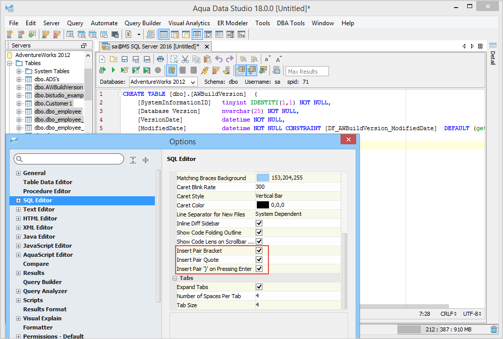 By default, Aqua Data Studio applies indentation of the current line to the next line when you press Enter. On unselecting this setting, no indentation is performed and the cursor is positioned in column 1 of the next line.
