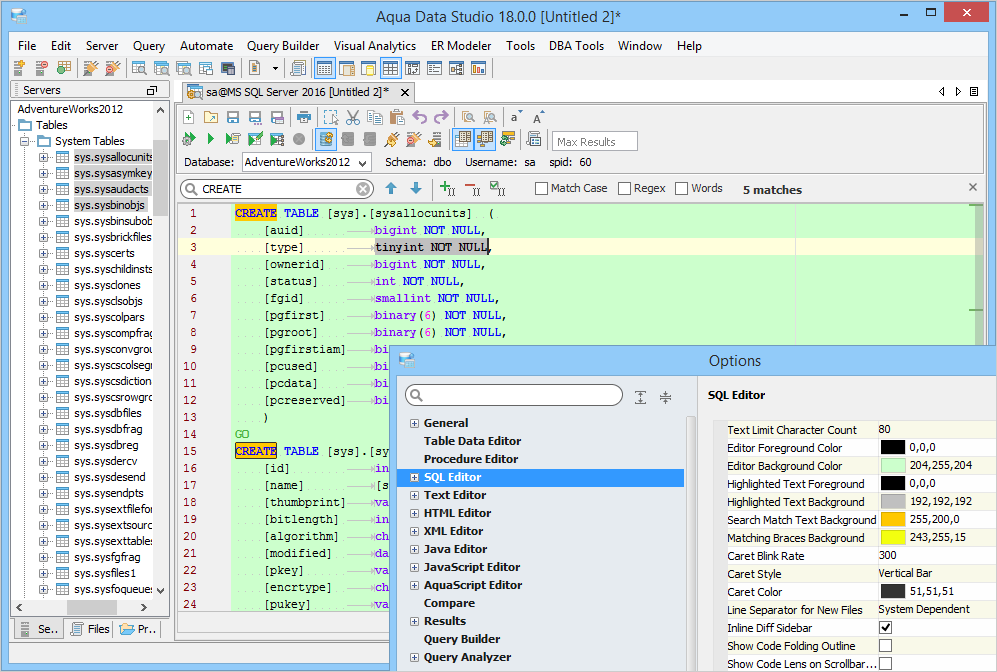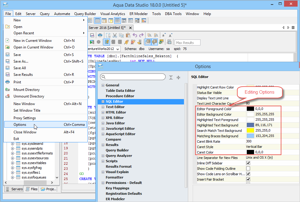 By default, a light gray vertical line appears at column 80 in the editor, indicating where a line exceeds 80 characters. You can set this text limit indicator to another value from the Options dialog. If you change the font, Aqua Data Studio plots the line based on the word space of the set font.