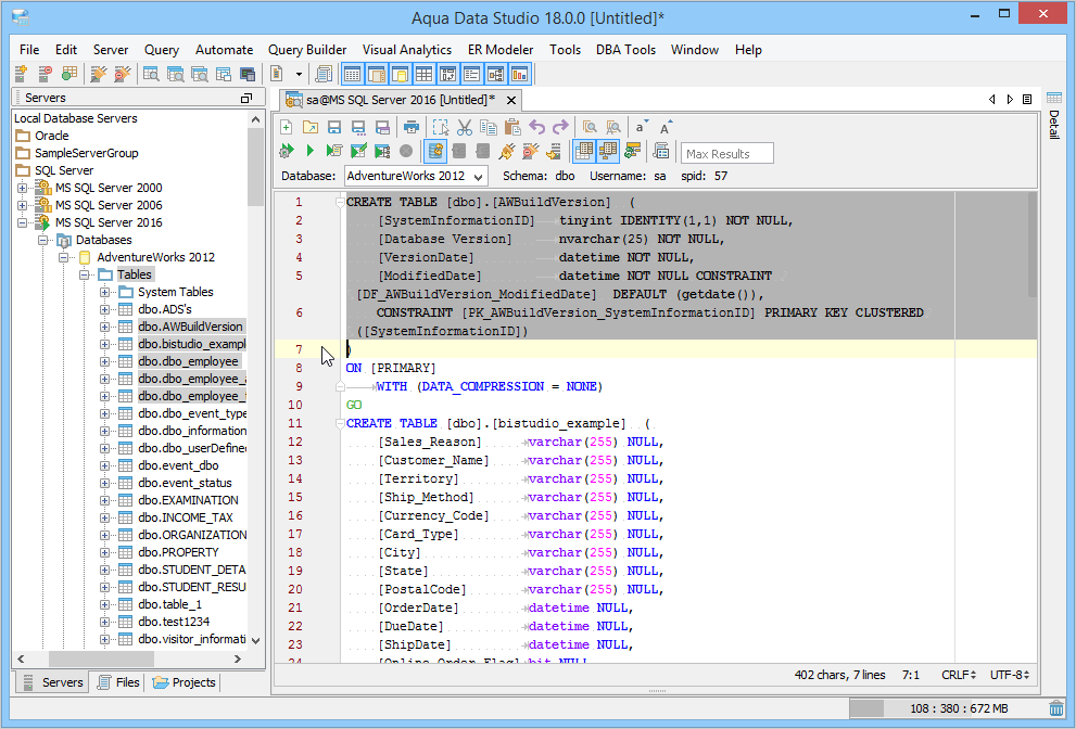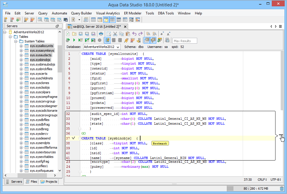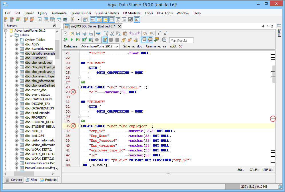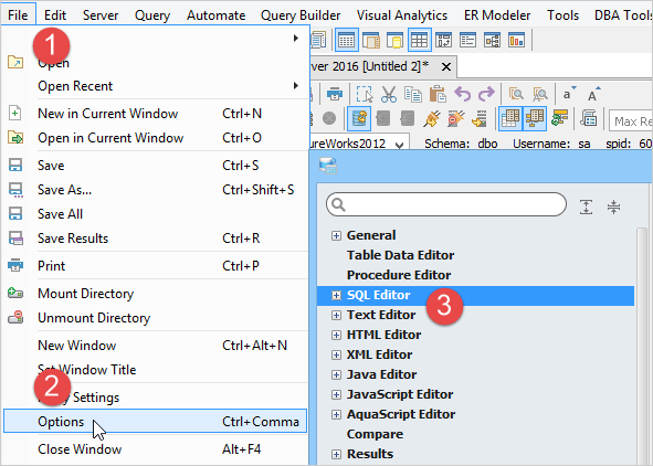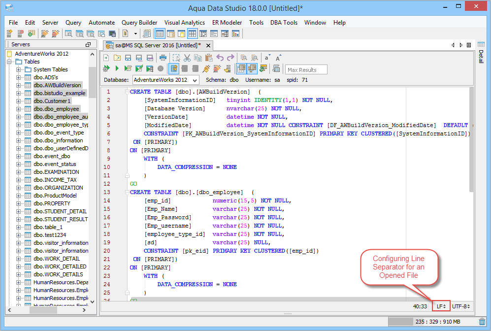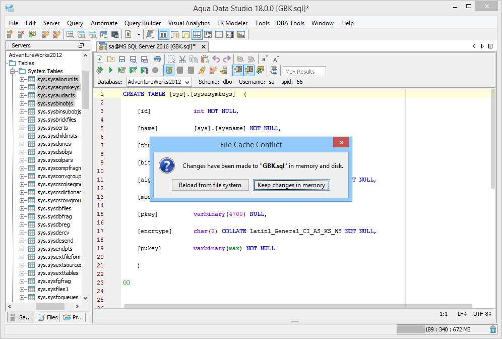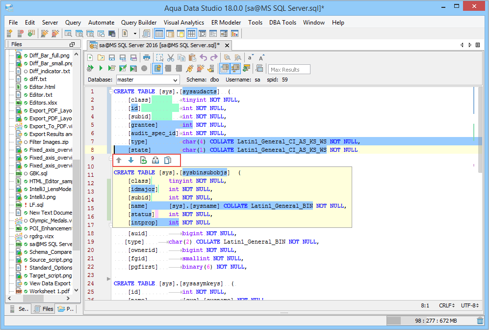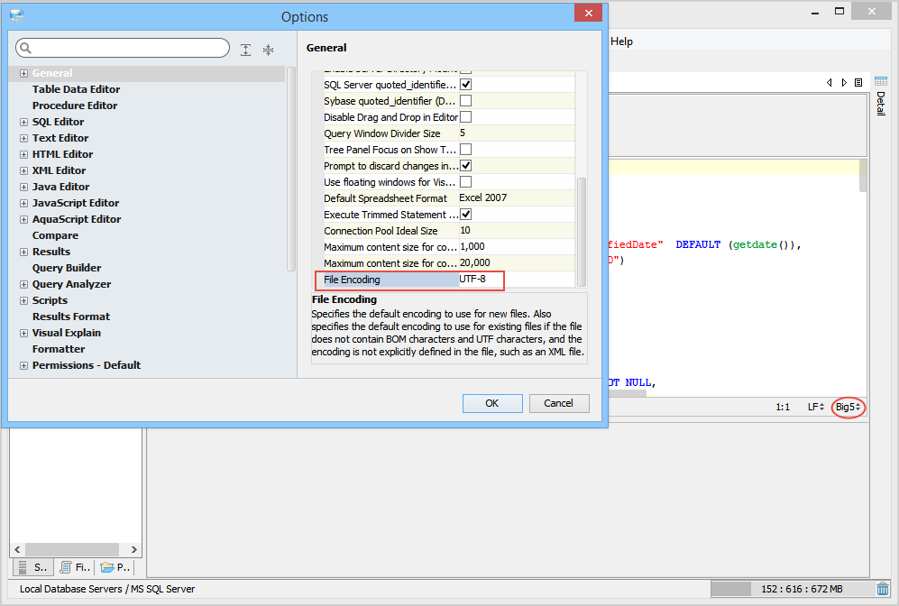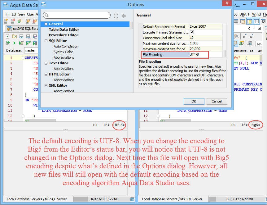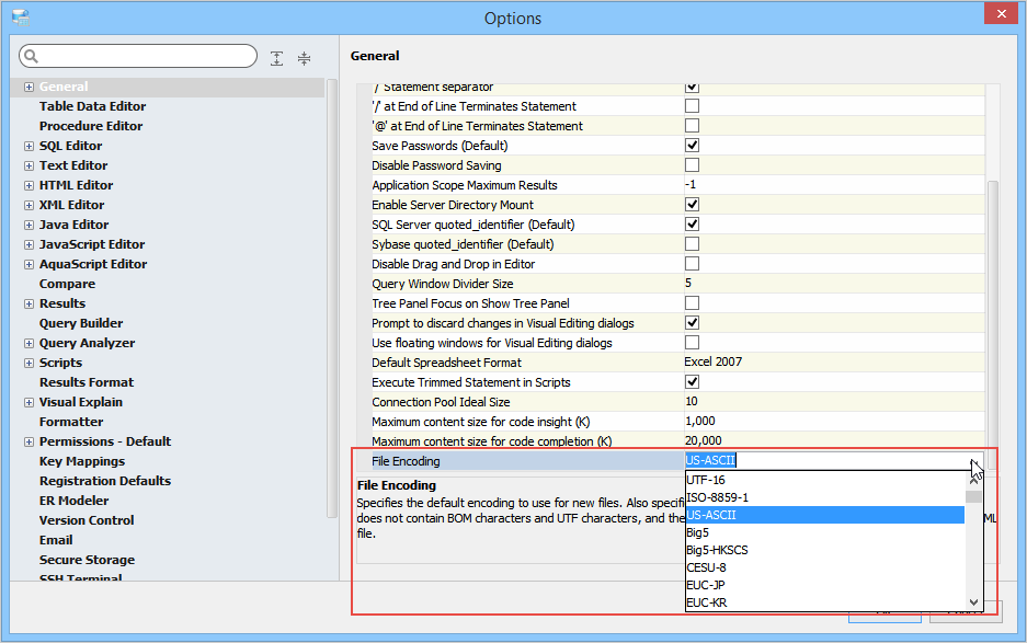 By default, the maximum content size for code insight features is 1000 K. If that limit is exceeded, all the code insight features, such as automatic code folding and tag completion are disabled. The maximum content size for code completion is 20000 K. If that limit is exceeded, features, such as code-completion, punctuation completion, indent guides and brace highlighting are disabled. In both cases, Aqua Data Studio displays the currently configured size and the actual content size.