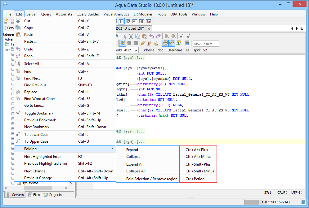 | Fold Selection / Remove region | Folds the entire selected code, even if the code folding setting is disabled. |
