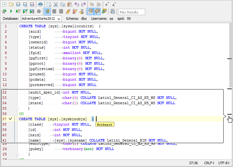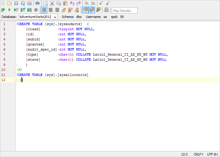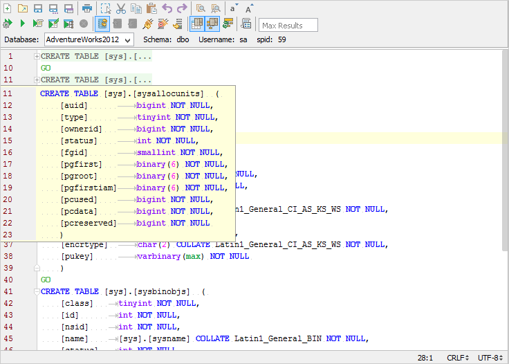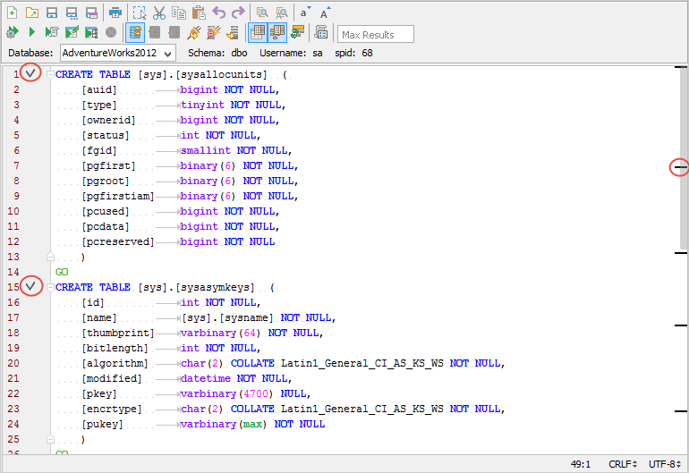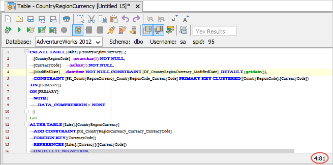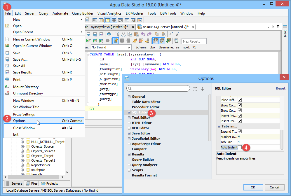 By default, Aqua Data Studio applies indentation of the current line to the next line when you press Enter. On unselecting this setting, no indentation is performed and the cursor is positioned in column 1 of the next line.