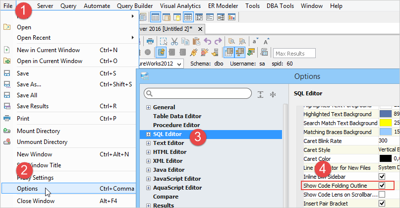 By default, the maximum content size for code insight features is 1000 K. If that limit is exceeded, all the code insight features, such as automatic code folding and tag completion are disabled. The maximum content size for code completion is 20000 K. If that limit is exceeded, features, such as code-completion, punctuation completion, indent guides and brace highlighting are disabled. In both cases, Aqua Data Studio displays the currently configured size and the actual content size.