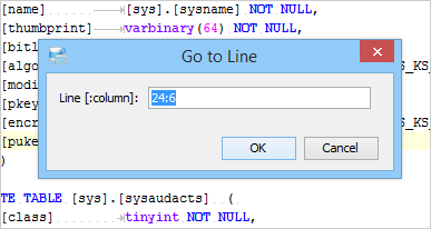 Go to Line navigates you to a specific line in the editor based on the user-entered number. You can view the current line and column number in the Status Bar. A colon separates the line and column number. To navigate to a specific line, click CTRL/Command+G and open the Go To Line dialog. Type the new line and column number separated by a colon, and then click OK.
