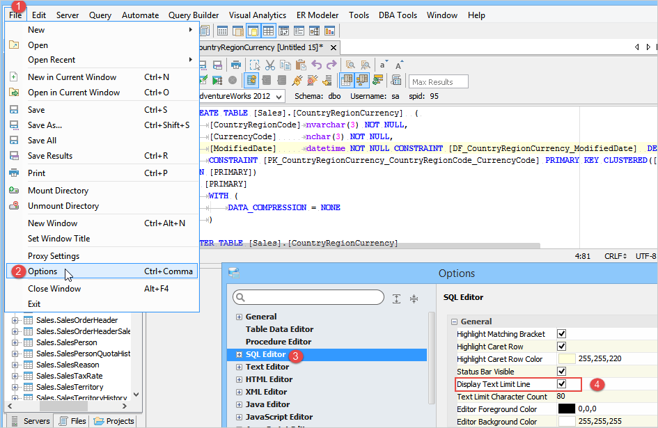 By default, a light gray vertical line appears at column 80 in the editor, indicating where a line exceeds 80 characters. You can set this text limit indicator to another value from the Options dialog. If you change the font, Aqua Data Studio plots the line based on the word space of the set font.