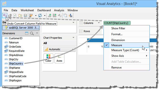 Drag a Dimension to Columns or Rows deck, then right click it and convert it into a Measure.