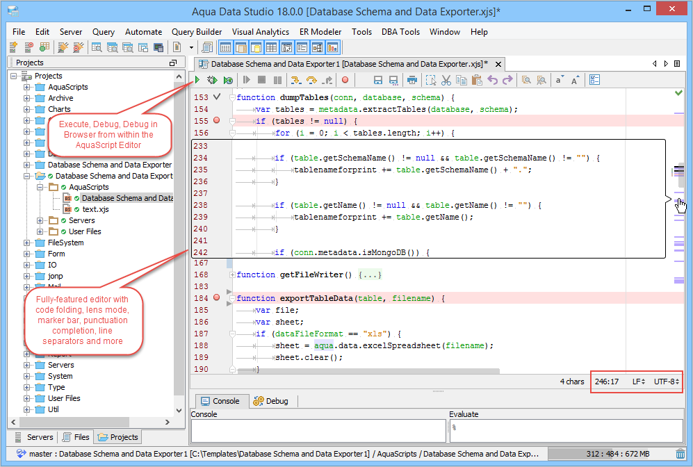 Execute Scripts in the Editor: With the AquaScript editor, you are able to execute an AquaScript in 3 different modes from the editor toolbar. The 3 modes include: Execute in console, Debug in Console and Debug in Browser. The Execute in Console allows the user to execute the script with the Console window as the primary out to the user. Debug in Console allows the user to debug a script executed in Console mode. The Debug in Browser will launch a basic webserver within Aqua Data Studio and allow a browser to request the execution of the script, in which case the script may output to the console or to the aqua.response object which will be sent to the browser for HTML rendering. The latter is to allow a user to write and debug scripts that will be deployed to Aqua Data Server as a web-based script or application.