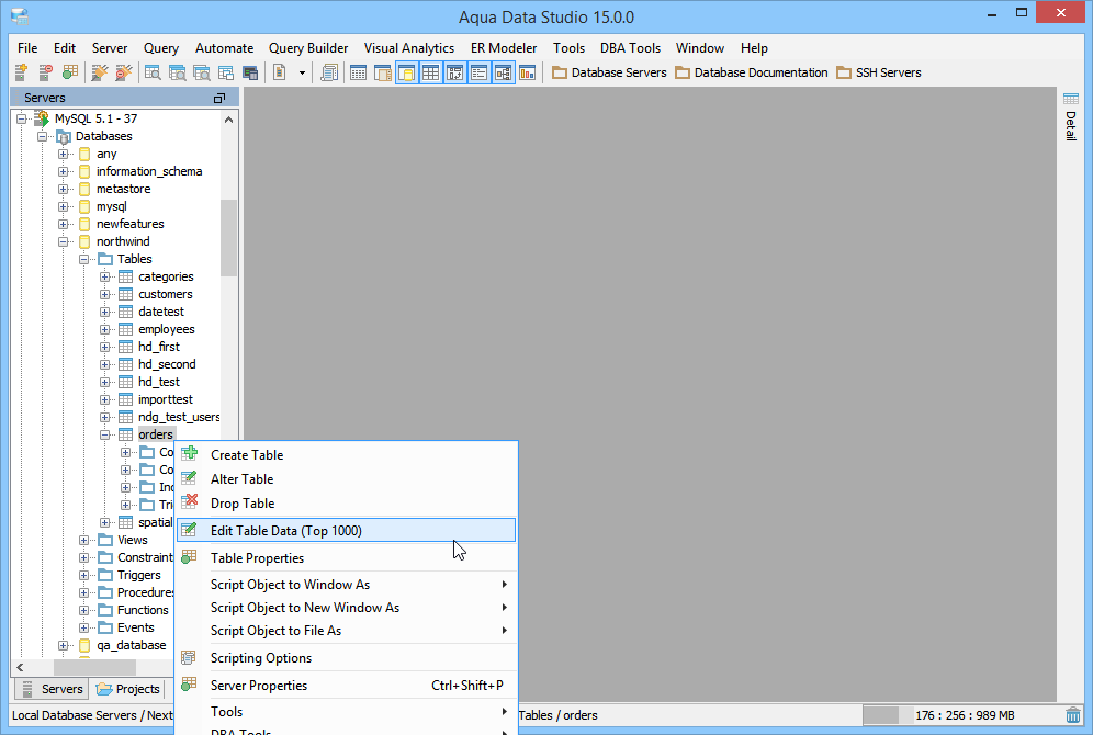 Aqua Data Studio provides a Table Data Editor which allows a user to graphically edit the resultset of an executed query on a table, including its data and rows. The editable result set is displayed in an Excel like grid. To activate a table editor you must either right click on a table in the Schema Browser and select "Edit Table Data (Top 1000)" or write a table SELECT statement and use the "Execute Edit" button. This will execute the query and return the resultset in a new Table Editor window. From this window a user may edit and save the contents of the resultset. The editor uses the primary key or any unique constraint to identify the row in the result which it will generate UPDATE statements for. If your resultset doesn’t have a primary key or unique constraint, you will be prompted to define a primary key in the primary key tab. A check mark indicates which column(s) participate in the primary key. There is an option within File->Options->Permissions to allow Primary Key Definition Changes. Table Data Editor Workspace Like the other tools of Aqua Data Studio, the Table Data Editor is part of the Application Docking Framework. The window for the Table Data Editor can remain open as other tools in Aqua Data Studio are used. The Table Data Editor's menus and icons are taken directly from the Main Application Toolbar. Their functionality for refreshing and reconnecting to database servers has been included to make it easier to reconnect and refresh table data without having to access the Main Application Menus and Toolbar. At the top are the File, Edit and Window menus. Below are Toolbar icons for Refresh, Reconnect, Save and Refresh, Save and Close, Save Script ("Save Script" stores the chosen directory path and uses it for subsequent save operations as a default directory for easier navigation), Stop, Add Row Above, Add Row Below, Clone Selected Row(s), Clear All Changes, Clear Selected Deleted Rows, Clear Changes in Selected Cells, Set Cells to Null, INSERT Current Date and Time, INSERT Current Date Only, Edit in Window, Close Window, Max Results, Aggregate Functions (when enabled) and Quick Filter. Below the Toolbar Icons are the tabs for Table Data, Primary Key, Preview SQL and Messages. The Window menu can be used to cycle through tabs when so many exist it is difficult know which one was focus via Window->Next Tab; Window->Previous Tab; Window->Focus Max Results. The layout of the data within the Table Data tab functions similar to a spreadsheet appliction, with the ability to insert rows and cells where desired via Find and Replace when needed. Most of the work done in the Table Data Editor occurs in the Table Data tab, which displays the data for the table(s) from the select statement used in the Execute Edit mentioned earlier. Row color and bolding assist in displaying recent changes and nulls in the data, and appear in the Table Data Editor modification logs (when enabled in File->Options->Table Editor->Modification Logs). A box appears around the content inside of a selected cell to identify content length where blank spaces may appear before text, but not be visible. Table Columns, must be added or removed from tables via context menus with right clicks in the Schema Browser or through the Query Analyzer by way of database commands. Using Edit->Format: AutoFit Column Width, cells can be highlighted and resized automatically using the menu, a key shortcut, or a double-click on the right border of the column header. This option can be configured from the dropdown menu. The Primary Key tab displays a list of all of the columns relating to the tables in the query used to launch the Table Data Editor via the Execute Edit command from the Query Analyzer. If more than one table was used in the query, a dialog appears to choose the primary keys and an additional Primary Key tab will display for each table with schema information in the tab title. The Preview SQL tab displays the DDL used to perform the edits made within the Table Data Editor with appropriate Syntax highlighting. The Messages tab displays any warnings or messages during table data modification. At the bottom of the Table Data Editor window are the Preview Panel (when enabled) and Status Bar. The Preview Panel creates a cell's preview in a split panel to allow the user to preview the currently selected value in the grid. This helps the display the full value of a narrow cell, including long string values or CLOB values. The Status Bar contains Pattern information to show the data type and range of selected cells at the bottom left, and Total Rows of the table at bottom right. After the changes are saved and the table is refreshed (Save and Refresh), the cursor selects the first cell of the selected row before save. When closing a modified window the application will prompt for "Save," "Discard" and "Cancel." Visual Editing The Table Data Editor allows you to add, edit and delete rows and changes in the editor are color coded so that you may see your changes before commiting them. Inserted/Modified/Deleted rows have light blue cell background. Modified cells have a slightly darker color for the text so it allows the user to see spaces. Cells in Inserted Rows also have the background color of the text shaded to identify invisible characters.