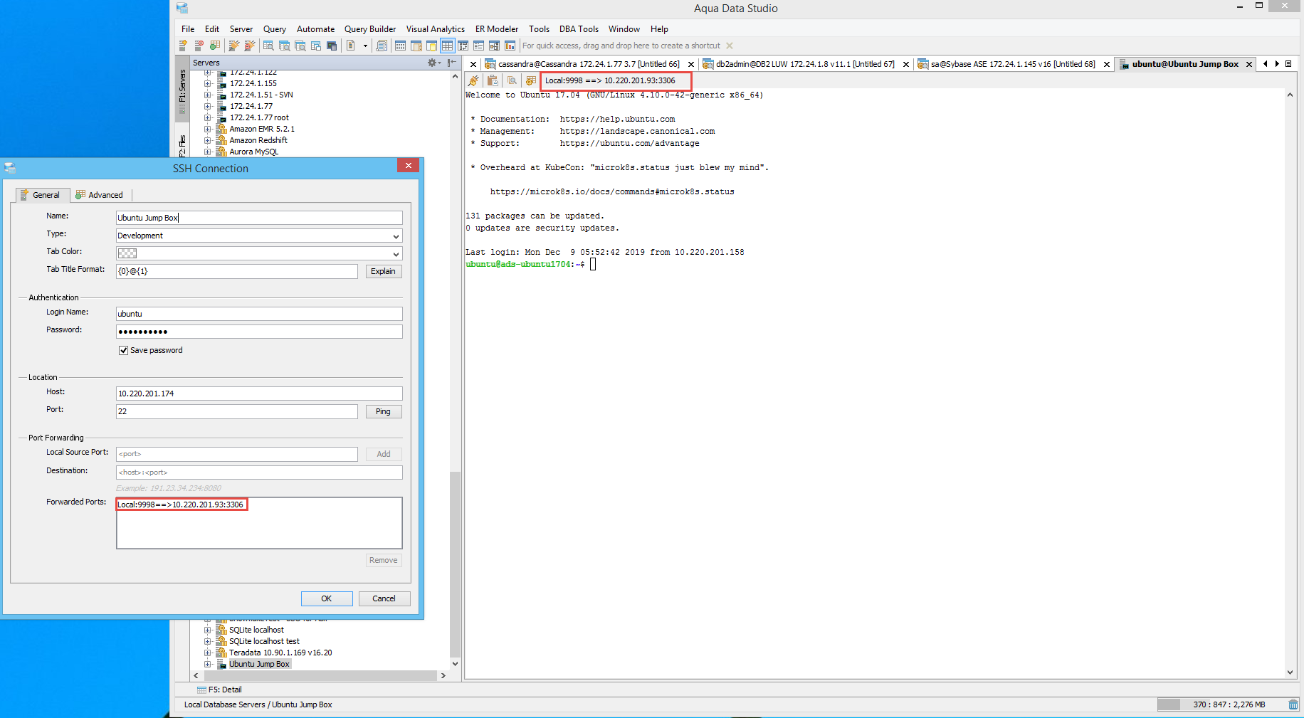 In the following example, we'll use our previously configured SSH connection with port forwarding to connect securely from ADS to MySQL database running on the 10.220.201.93 server on port 3306. Also in this example, the 10.220.201.93 server is firewall protected to keep out external attackers so that you can’t directly access the database server. It is configured to be accessible only from the 10.220.201.174 jump box.