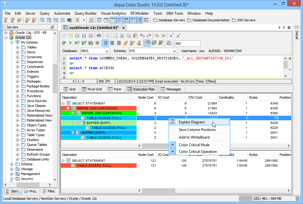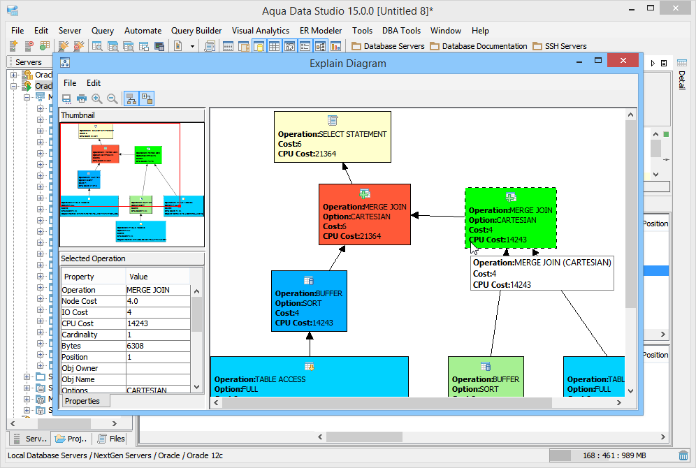 The Visual Explain Diagram in Aqua Data Studio offers a modifiable graphical illustration of an explain plan results. The operations are rendered as a tree of nodes, with the most significant elements colored according to the percentage cost relative to the entire statement. The Thumbnail view at the top left of the window underneath the save as and print icons gives a bird's eye view of the diagram. Stretching and resizing the red outline within, it pans and zooms the diagram. Underneath the Thumbnail view are the Selected Operation execution statistics details displayed for the currently selected diagram object. The size of nodes in the diagram is altered by selecting a node with a left-click and stretching its handles. Nodes may be repositioned by dragging them to a new position. The Zoom In and Zoom Out magnifying glass icons at the top left of the above diagram pane are useful for focusing on specific nodes. Use Visual Explain Diagram to quickly identify areas of your SQL statements which may require tuning. See the Example Query Tuning Demo for a real-world scenario. With the Visual Explain Plan Diagram, it is possible to: