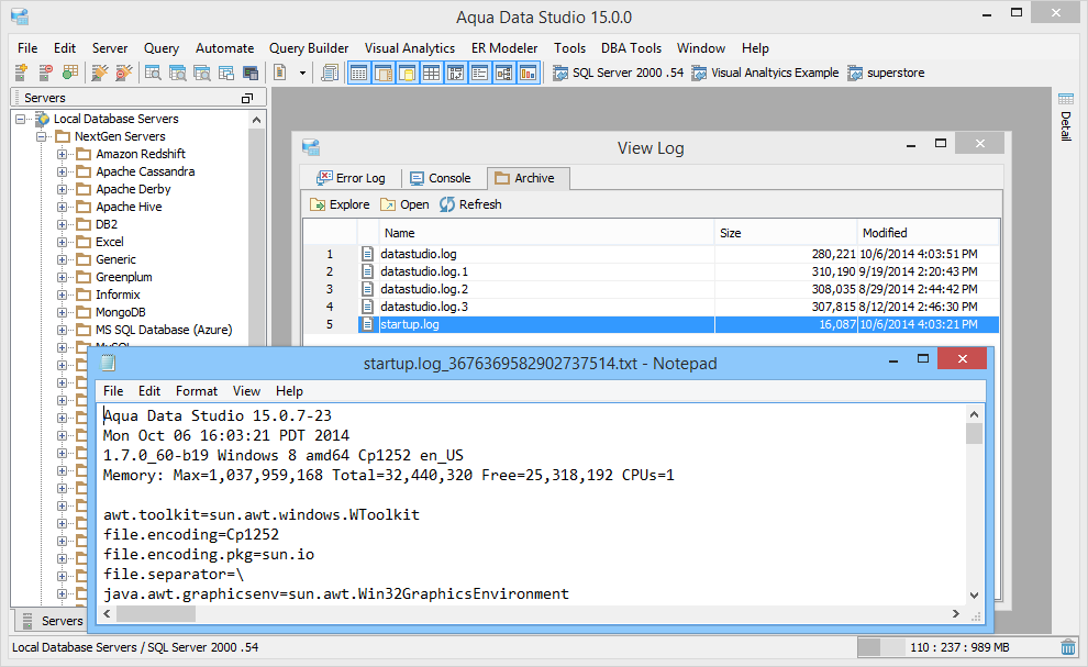 Displays information on Aqua Data Studio's most recent launch, including version number, date, time, Java version, memory use, system CPU count and file encoding.
