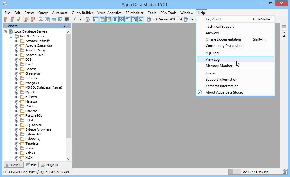 The View Log window provides three tabs for examining logs, errors and actions taken by Aqua Data Studio. This is useful for troubleshooting issues and support questions, and monitoring server connection status. The Logs and Support information can be found under the main application menu item Help