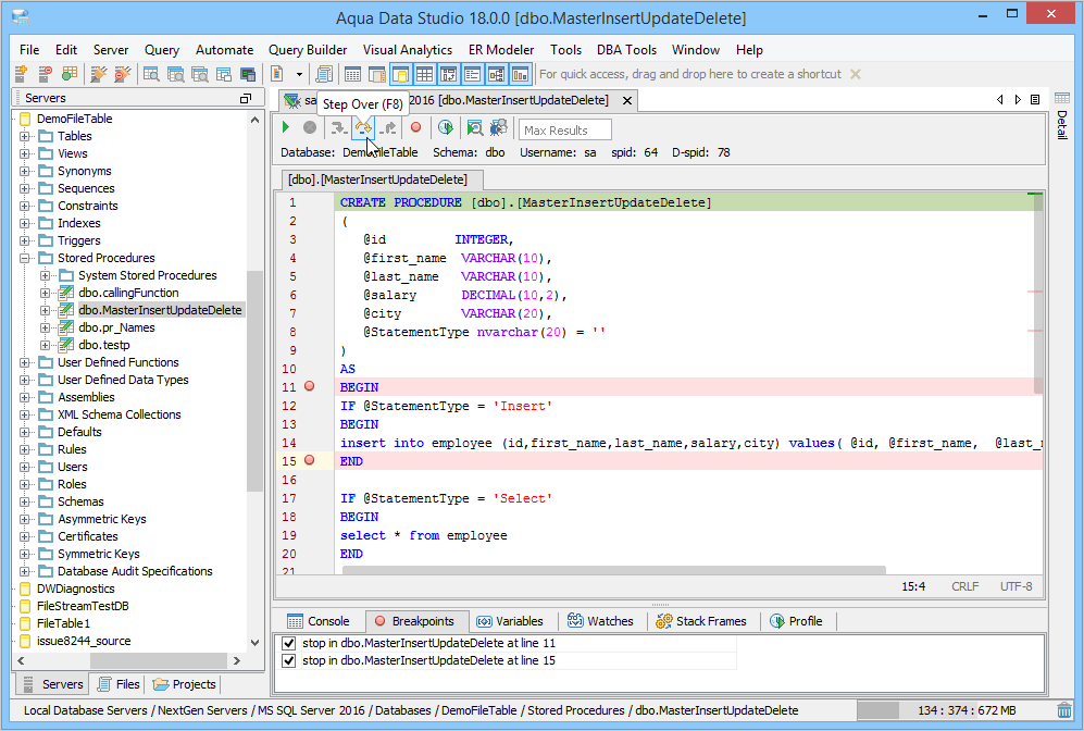 The MS SQL Server SQL Debugger has been designed to help with testing and debugging of SQL functions and procedures for MS SQL Server. It works with MS SQL Server version 2005 and above. Launching the Microsoft SQL Server SQL Debugger The Microsoft SQL Server SQL Debugger is launched through a right click in the Schema Browser on Stored Procedures or User Defined Functions and selecting Debug from the popup menu. More than one debugger can be open at once, with each object to be debugged opened in a separate tab. Debugger Workspace The debugger displays a slightly modified version of the Query Analyzer Toolbar containing debugger specific menus and buttons. Along the top of the debugger are the Execute, Stop, Step Into, Step Over, Step Return, Toggle Breakpoint, Turn On Profiling, Target Query Window, Debugger Query Window buttons. Next to the buttons is the Display Max Results input field. Beneath the buttons is the connection information, username and SID information. The procedure or package displays in the debugging window, within which breakpoints can be added by right clicking and selecting "Toggle Breakpoint" from the popup menu. When this window has focus, and a line has been clicked, it is also possible to select "Run to Cursor," to run the debugger up to that line in the procedure. From the same popup menu, "Go to Current Line" brings the cursor to the current line, which is very useful when debugging multiple lengthy procedures. Below the debugger window are tabs for Console, Breakpoints, Variables, Watches, Stack Frames and Profile. The Console tab displays any errors or messages generated as debugging progresses. The Breakpoints tab indicates the lines of the procedure where breakpoints are set and allows them to stop execution or not. The Variables tab lists any variables by name, their value and type. The Watches tab allows selecting specific variables to be observed as they change, reducing from a possible list of hundreds to a select group. The Stack Frames tab lists the local variables of the functions, and the arguments to them. The Profile tab lists commonly used terms or values a user works with on a regular basis in the debugging process. Once execution of a procedure has begun through the use of the Start button at the top of the debugger window, the bottom left of the window is occupied by the Text, Text History, Grid, and Pivot Grid Results tabs. This area functions just as the Query Analyzer window does, revealing the results of procedures at each breakpoint or execution cursor. The Microsoft SQL Server Debugger features include: