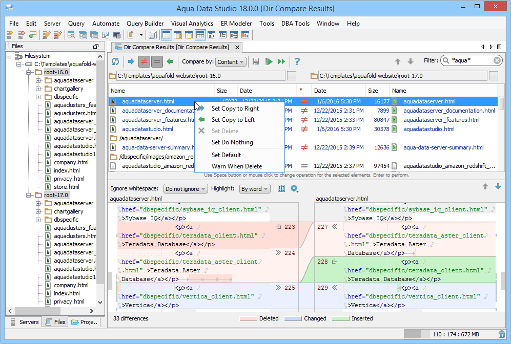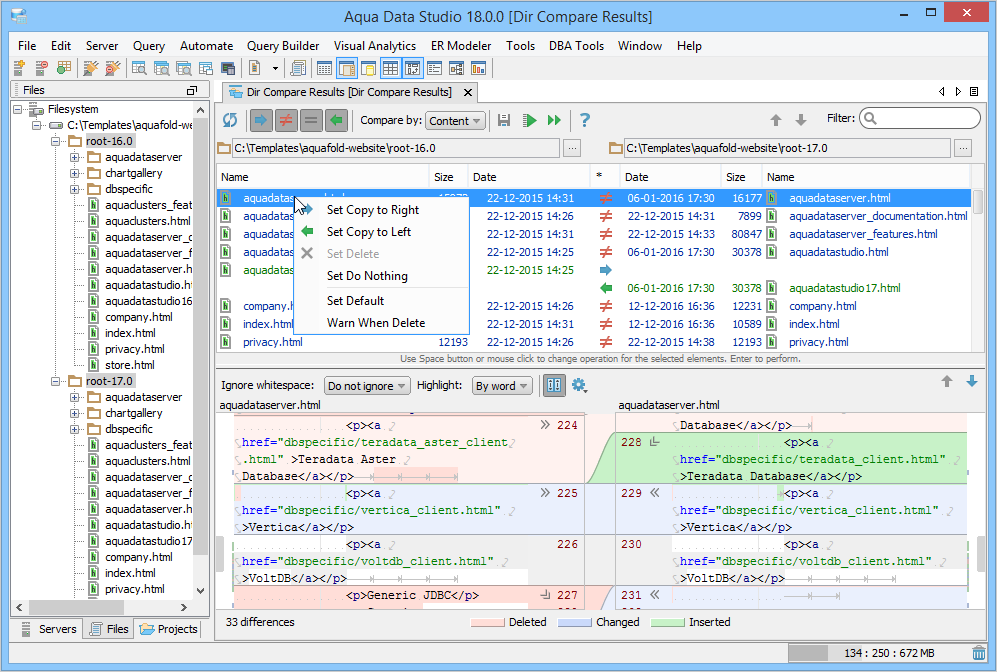 Directory Compare provides a method of identifying differences between contents of the directories and supports synchronizing selected or all differences of the selected files.