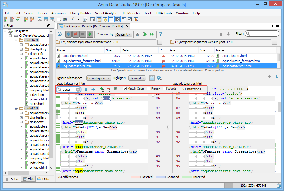 . The contents of the selected file are shown in the lower pane, also known as the Differences pane with the differences highlighted. This pane is further split into a split-pane where each file takes up half of the pane and shows connecting splines for identifying where the deletions, changes and additions occur. Comparisons show the character differences in a modified line with bolding and background color highlights indicate modified blocks. If they are not identical they are highlighted by default in pink (deleted), purple (changed) or green (added). These colors can be changed from the Options dialog. You can also use this tool to synchronize the contents of the directories