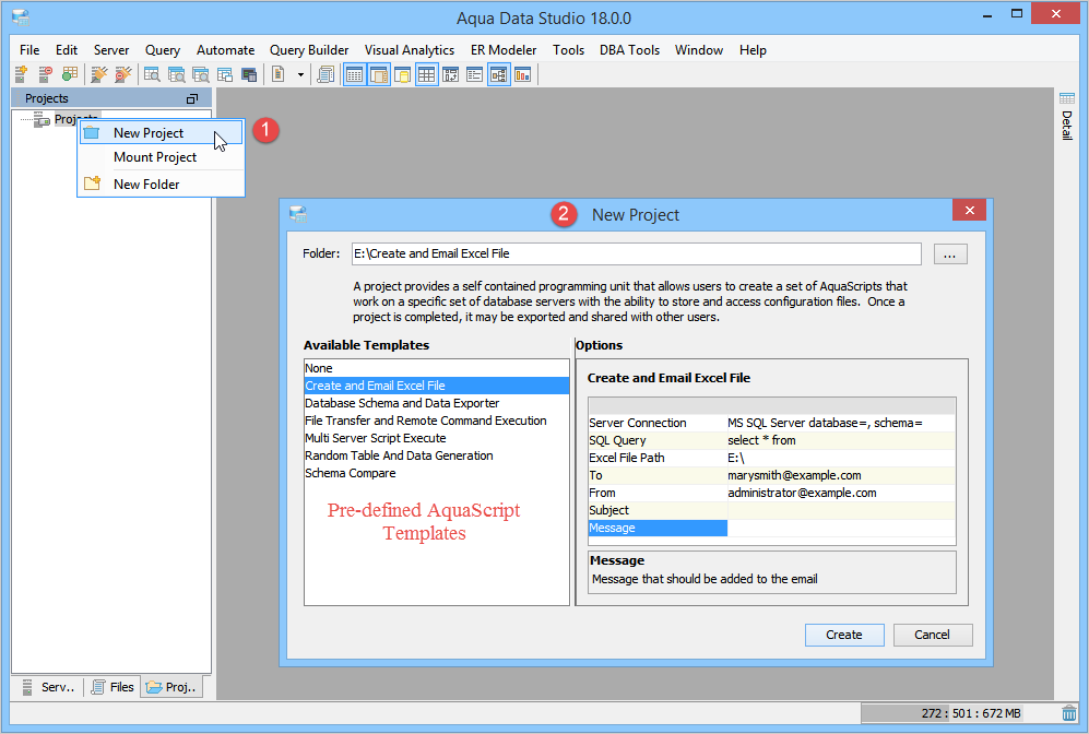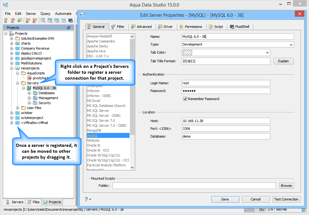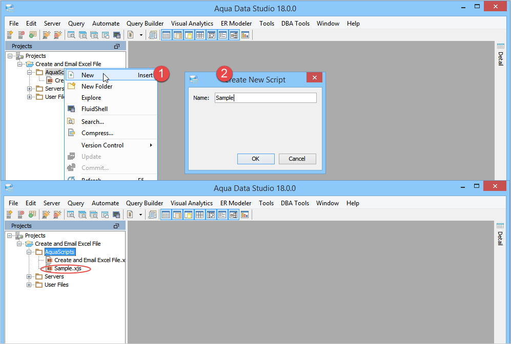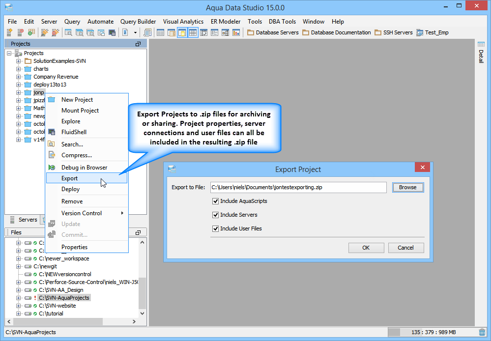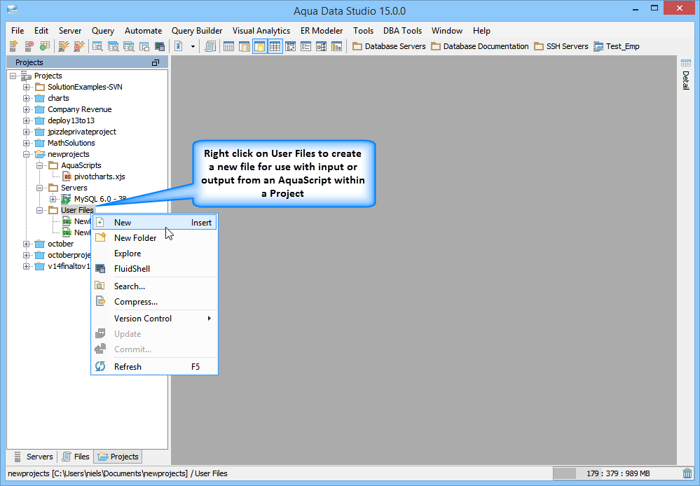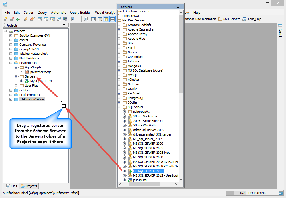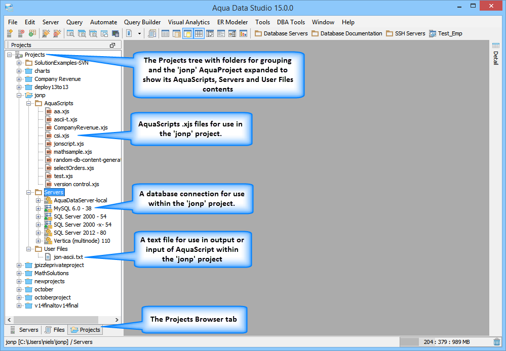 AquaScripts, Servers, and User Files: Every project has an AquaScripts directory, a Servers directory, and a User Files directory. The AquaScripts Folder holds all of the AquaScript (.xjs) files which can be executed and debugged. The Servers Folder can contain one or many registered database server connections for use by the AquaScripts in that project. If there is a server in the Schema Browser you wish to use in a Project, drag that server from your Schema Browser into the desired Project and the connection information will copy over. The User Files Folder contains files for input or output of the AquaScripts. The AquaScripts, Servers, and User Files folders can also contain multiple subfolders to assist with organizing Project content. Every Project is self-contained with its properties and can be exported as a .zip or compressed file for archiving.