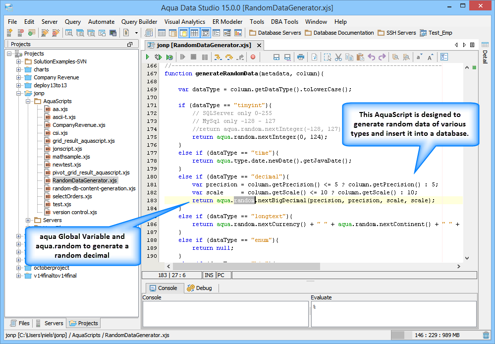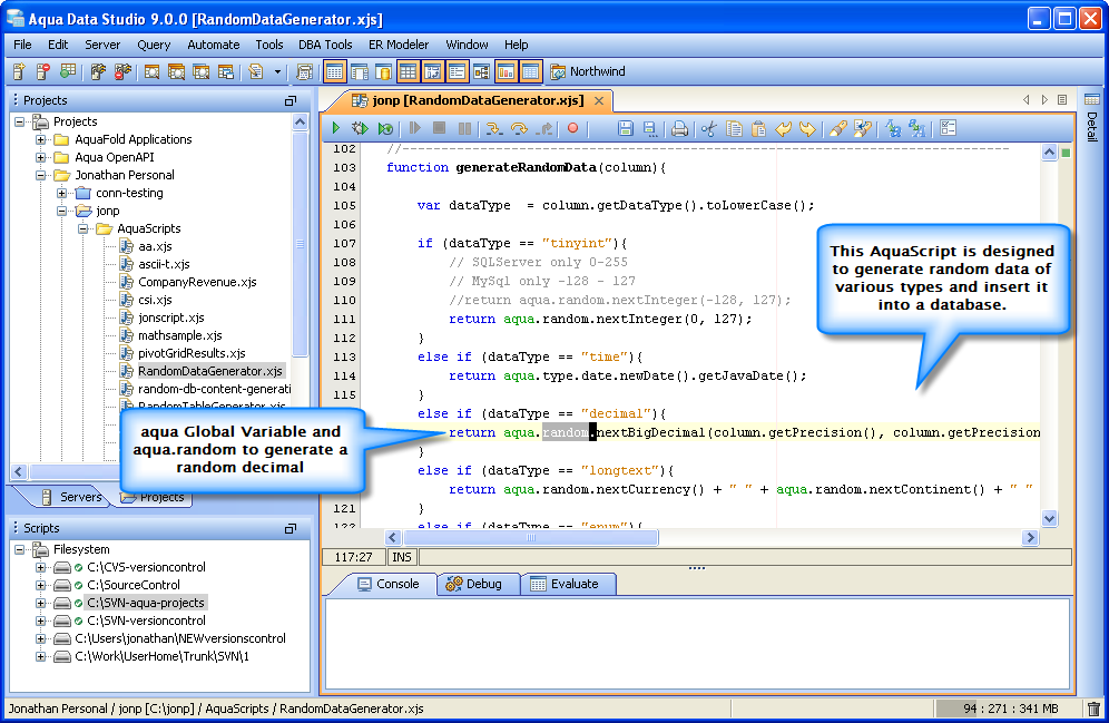 Open API Script Examples: A downloadable standard set of scripts is available for the application and contains examples of all the functionality available through Aqua Data Studio's Scriptable Open APIs. If you need to see how to implement a specific API Package, explore the Script Examples and edit them for your particular scenario.