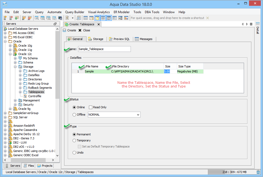 To create Oracle Tablespaces, connect to an Oracle server and expand the tree to view the Storage container. Right click on Tablespaces within the Storage container and select create Tablespace. Enter Tablespace Settings for Datafile name, file directory location, Status and Type. In the Storage Tab, set the properties for Extent Management (Automatic or Uniform Allocation), Segment Space Management (Automatic or Manual), and Logging. Adjust the Block Size as needed. Preview the SQL in the Preview SQL tab. Click OK to finish.