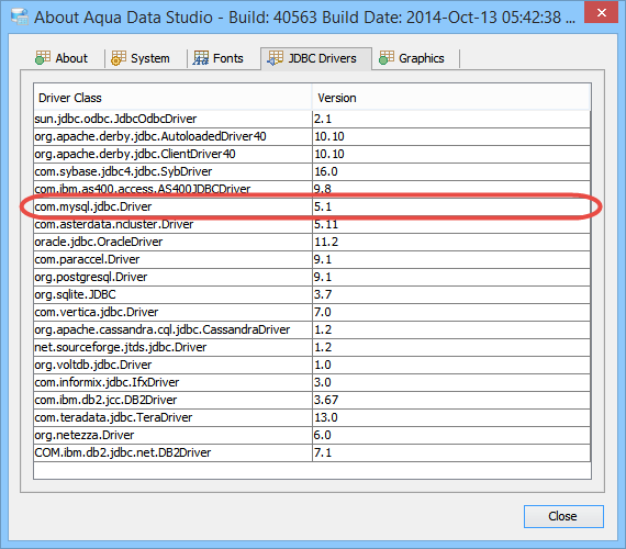 The MySQL JDBC (v5.1) drivers included with Aqua Data Studio work across all versions of MySQL from 3.x to 5.7. MySQL server releases are very frequent, and may sometimes require updating the JDBC driver.