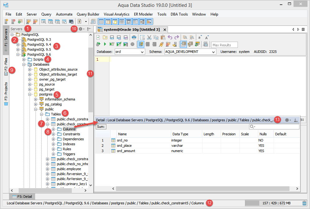 The Schema Browser functions as a navigational aid for database administration and query editing. It also assists in organizing SSH Servers (see the SSH Browser for more information on expanding and collapsing SSH Servers in the tree). Server Groups, servers, and connections can be renamed and dragged and dropped to organize them. Context sensitive menus are accessible inside the Schema Browser through right-clicking on schema objects or keyboard shortcut (ALT + DOWN ARROW) once an object is selected. The Schema Browser can be docked or undocked as an individual panel as part of the Workspace and Docking Framework of Aqua Data Studio. A tree is used to display database server objects, allowing for rapid location of schema objects. When an object is selected in the Schema Browser, the Detail View displays contents or status. Icons for database servers change to indicate whether server connections are connected (green triangle), disconnected (orange vertical bars) or failed (red block) in the Schema Browser. The icons for server type also vary based on if they are Production (gold gear), Development (gray nodes) or Test (blue bug) servers.
