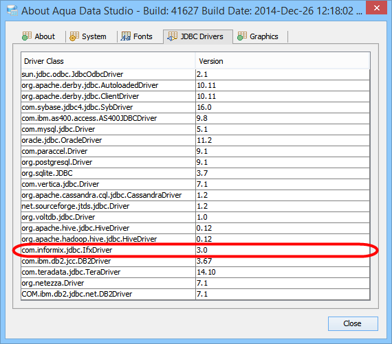 To update the Aqua Data Studio JDBC drivers for Informix you need to overwrite the Aqua Data Studio ifxjdbc.jar file. Below is a listing of the Aqua Data Studio library directory [ADS_INSTALL]\lib\drivers\ ...
