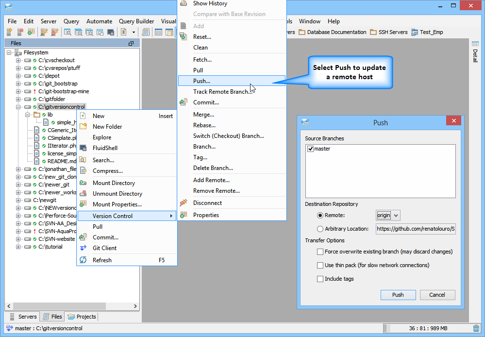 Now next time you try to "Push" this remote server will be available under the Destination Repository in the drop down. See step 2 in Push your changes to remote Git Repository in github, google projects, heroku, gitorious etc Create, Delete Branches, Switch and Checkout A single Git repository can contain any number of branches. To create a new branch using Aqua Data Studio follow the below steps