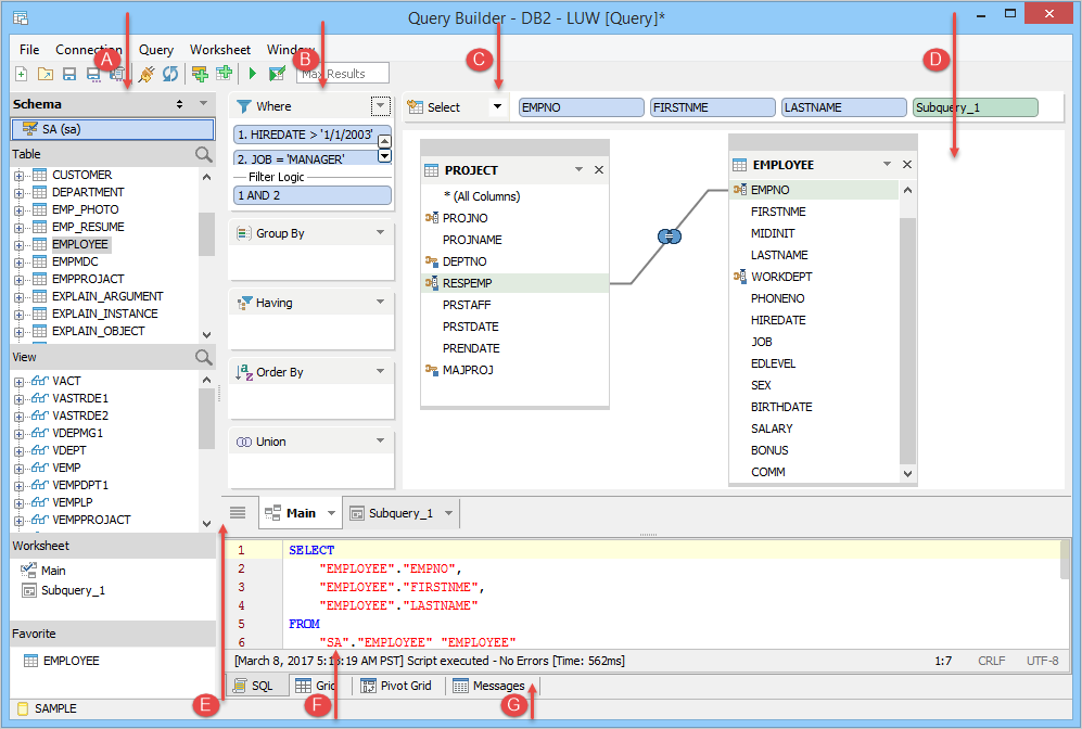 | Main, Subquery, Union, Derived Table Tabs | SQL Pane | Results Tabs |