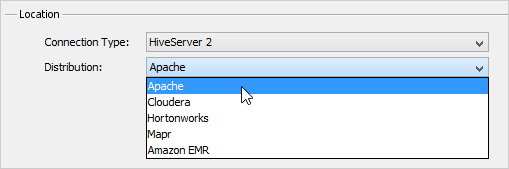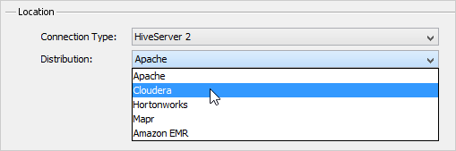 Once you've pasted the Apache Hive JDBC drivers in <ADS_INSTALL>/lib/drivers and restarted Aqua Data Studio, set the Server Properties > General tab Location Connection Type (choose HiveServer 1, HiveServer 2, Impala or Spark SQL) and Distribution drop-down to Apache Hive and connect.