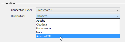 Once you've pasted the Amazon JDBC drivers in <ADS_INSTALL>/lib/drivers and restarted Aqua Data Studio, set the Server Properties > General tab Location Connection Type (choose HiveServer 1, HiveServer 2, Impala or Spark SQL) and Distribution drop-down to Amazon EMR and connect.