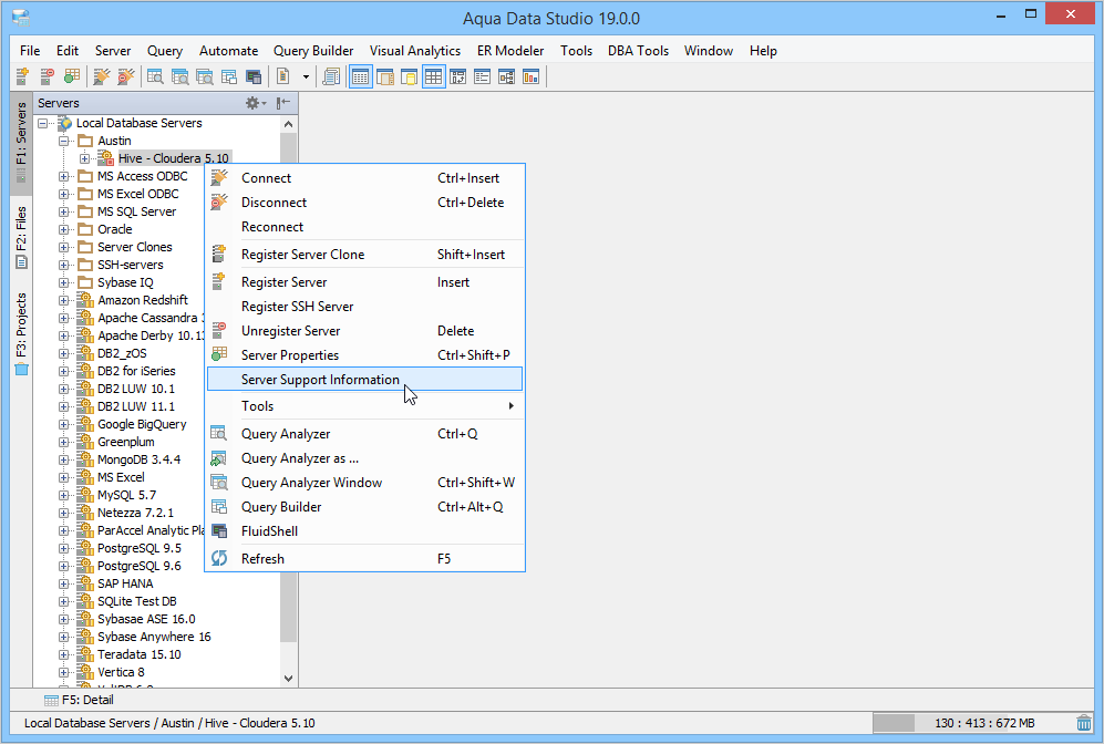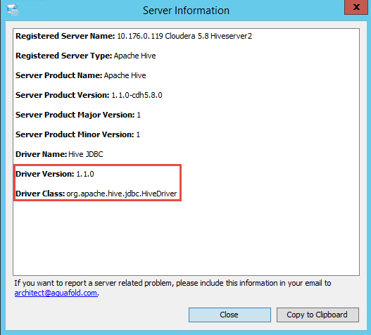 Click on the Server Support Information dialog. Right click on your hive server listed in the Aqua Data Studio schema window and select the Server Support Information dialog. Below is an example screenshot of the default Hive drivers.