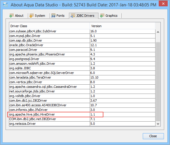 Click on About Aqua Data Studio > JDBC Drivers. The Apache Hive drivers are loaded dynamically so you must connect at least once to your distribution to see what version is listed in the JDBC Drivers dialog. Below is an example screenshot of the default Hive drivers.