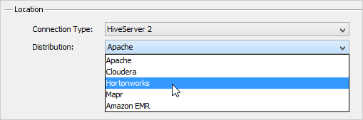 Once you've pasted the Hortonworks JDBC drivers in <ADS_INSTALL>/lib/drivers and restarted Aqua Data Studio, set the Server Properties > General tab Location Connection Type (choose HiveServer 1, HiveServer 2, Impala or Spark SQL) and Distribution drop-down to Hortonworks and connect.