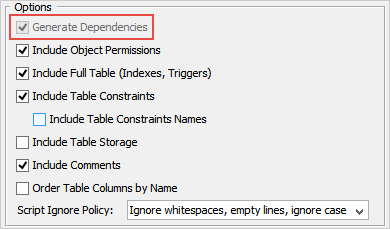 For schema synchronization, we recommend that you unselect this option and then from the Schema Objects area, select Indexes and Triggers. Selecting these check boxes also enables schema synchronization to include the DDL of trigger or index created on View or Materialized View in the deployment script.