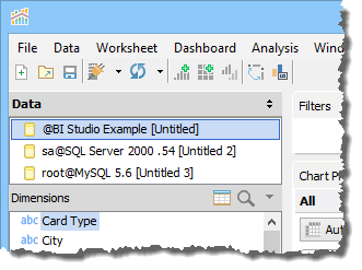 A Worksheet can only use one Data Source at a time. A Workbook can have many Data Sources, with each Worksheet using a single Data Source. You can tell which Data Source has at least one Measure or Dimension in a Row or Column Deck within the current sheet when a check mark appears over the Data Source icon.
