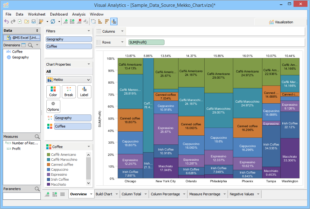 When you enable the Show Column percentage check box, Visual Analytics displays the profit percentage of each coffee brand against all coffee brands.
