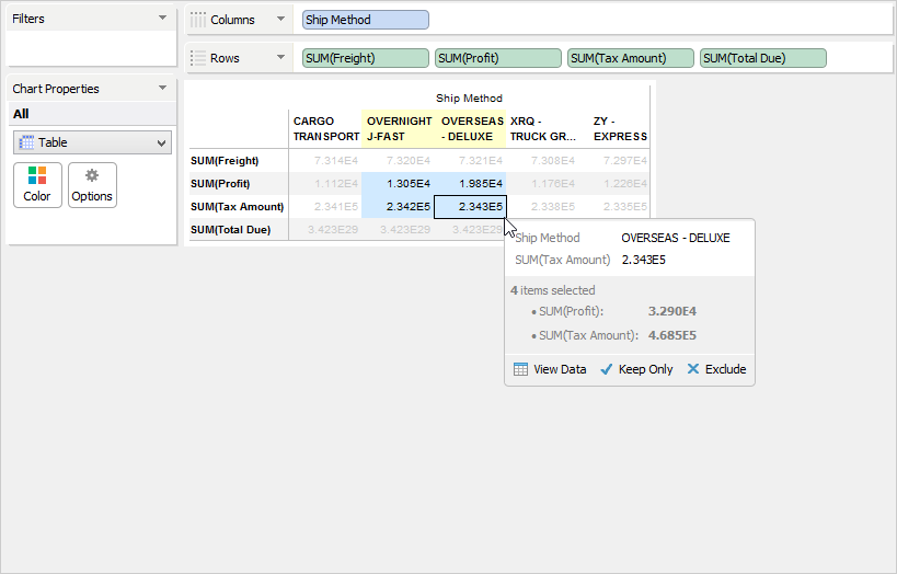 It is also possible to drag across several cells within the table and see a tooltip that summarizes all of the data you have selected. Selected cells within the body of a table have a light blue background color while the other cells dim to make your selection stand out.