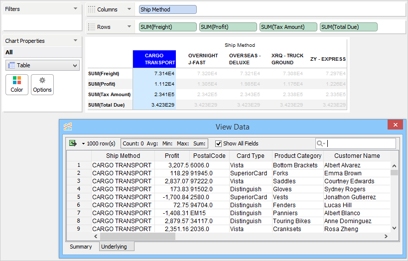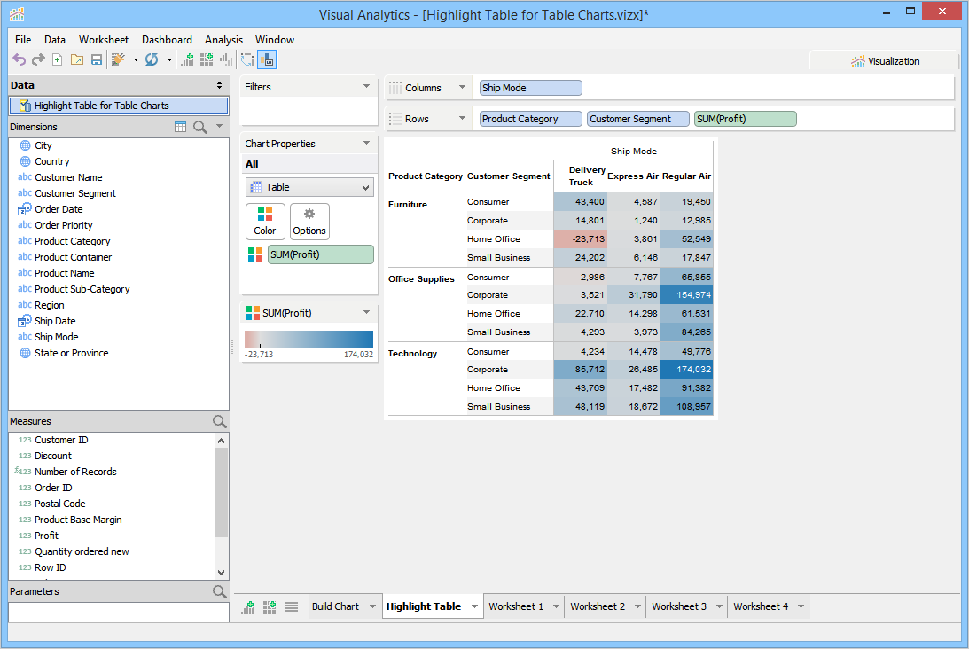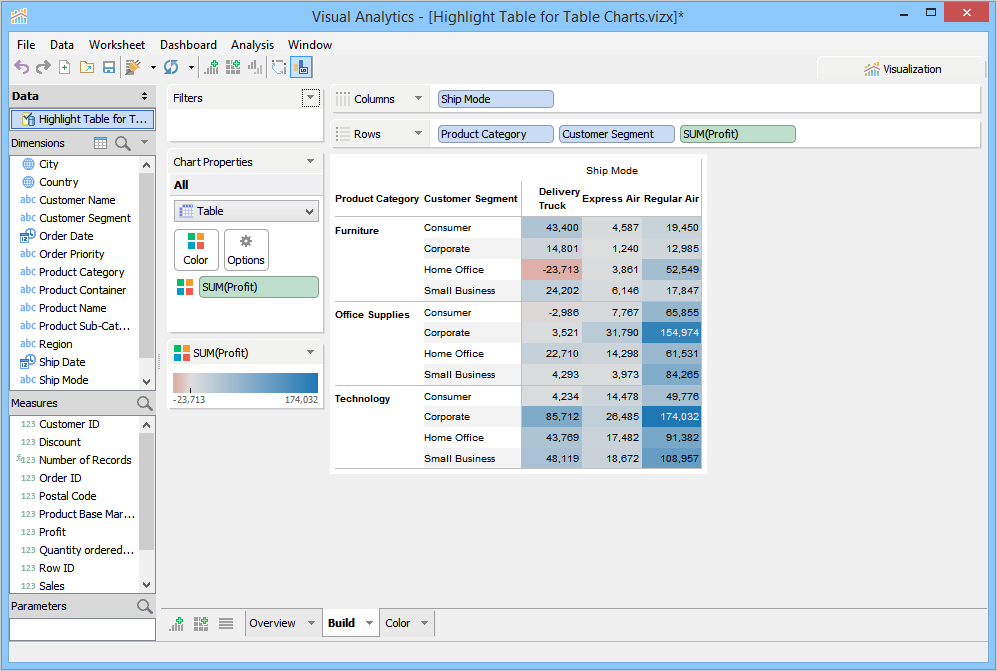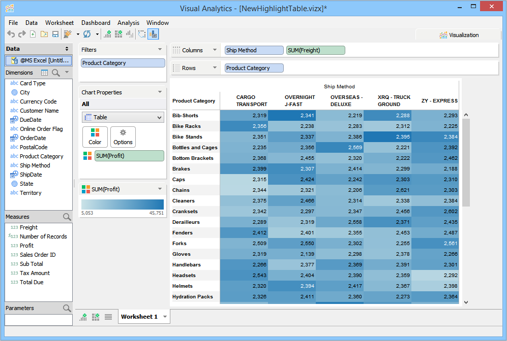 Visualization builds a Highlight Table and moves Ship Mode, Product Category, and Freight to the Rows Deck, and moves Profit to the Color Deck and applies a default color theme to the background cells of the Ship Mode rows. In the given example, we have moved Ship Method and Freight to the Columns Deck.