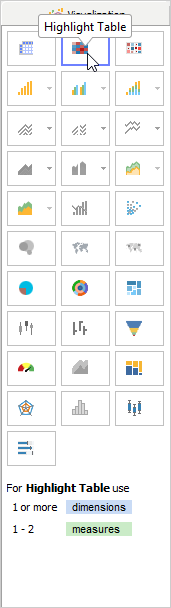 There are two ways of building a Highlight Table. We are using the Visualization Palette. Another way is to build a table first and then from the Options Deck, choose Highlight Table.