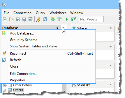 While in the process of using the Query Builder it is possible that you or someone else drops or adds a database object from the database server you connected to or need to connect to. To incorporate schema, database, and table changes that have occurred since you began working in a Query Builder worksheet, select [Connection > Refresh].