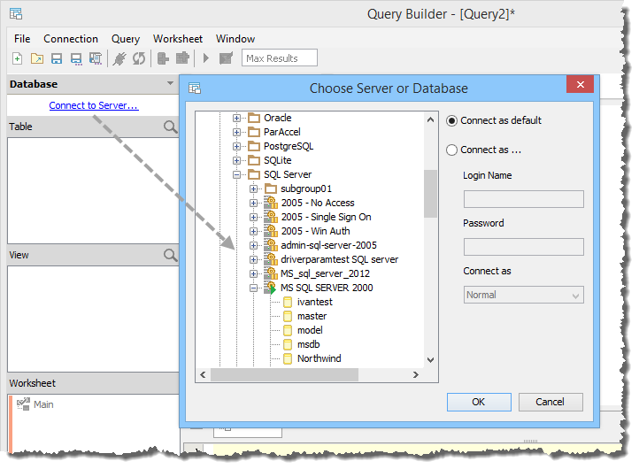 If the Query Builder is launched without right clicking or selecting an object in the Schema Browser, no databases or Data Sources are listed in the Database Pane when it opens. To connect to one, left click the [Connect to Server...] text inside the Database Pane to create a new connection. The [Choose Server or Database] Dialog appears which allows you to expand a registered server and connect a database.