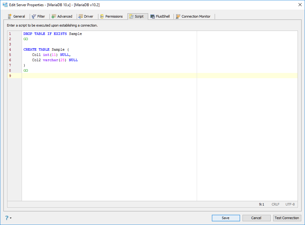Edit Scripts in Server Properties in Aqua Data Studio: