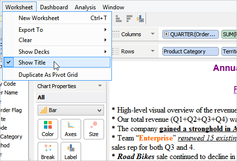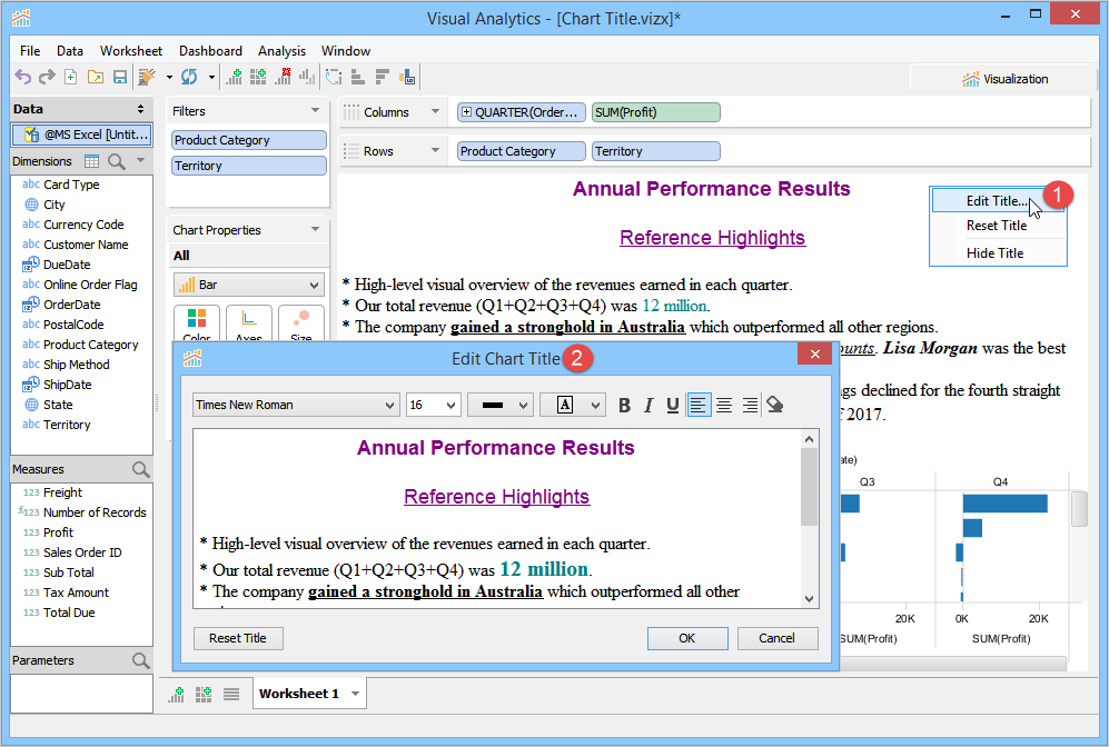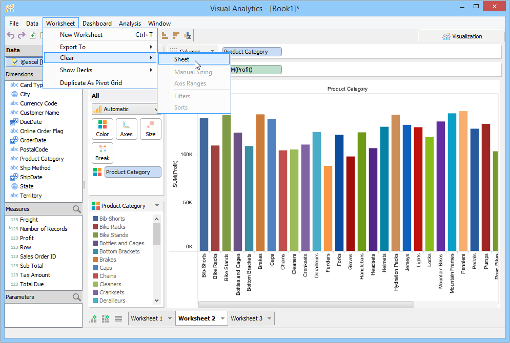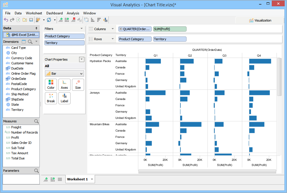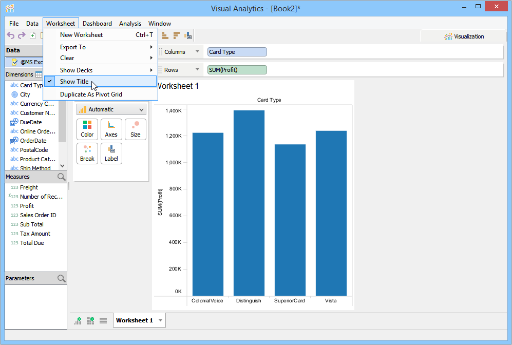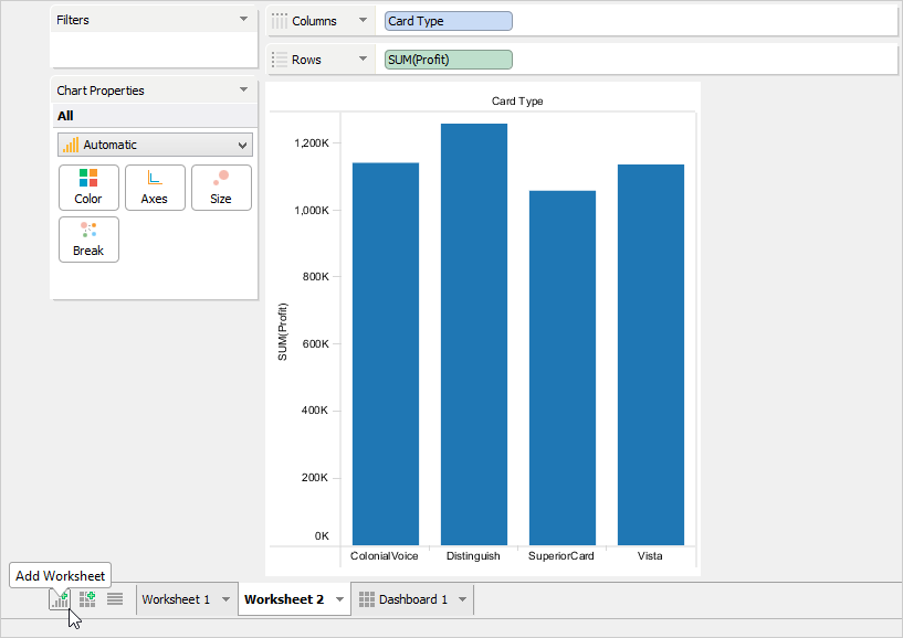 When you launch Visual Analytics for the first time, it automatically generates a sheet labeled "Worksheet 1” and displays the sheet name as the chart title in the chart view. This sheet name can be edited, formatted, and shown or hidden from the chart view. For more information, see Chart Title. If you want to create additional sheets, perform one of the following steps.