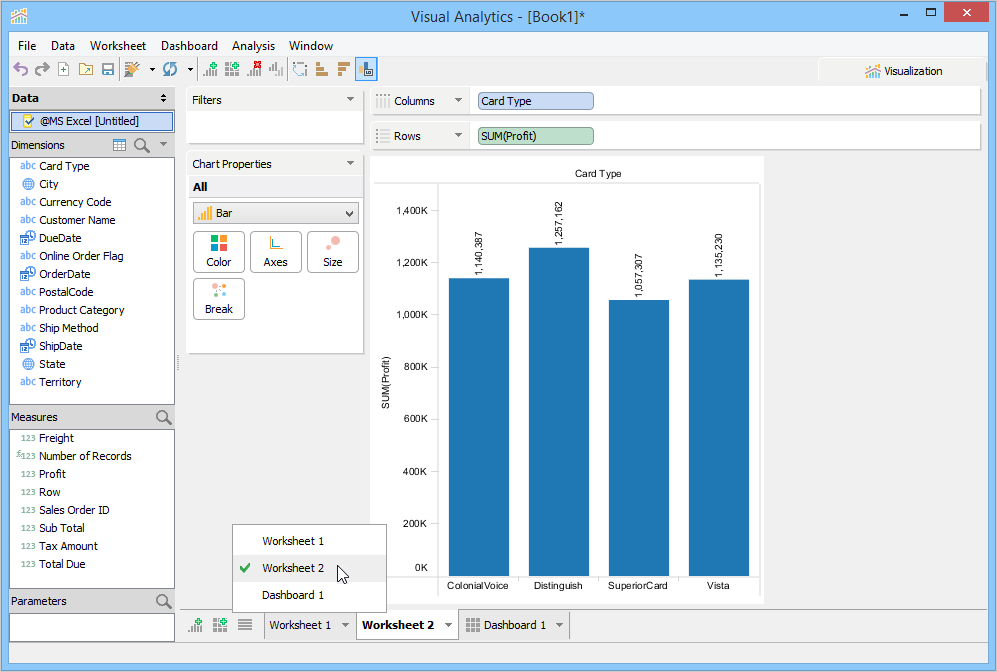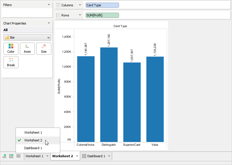 A Sheet is where you create Views by arranging data with drag and drop by placing Dimensions and Measures into decks. Each sheet, whether it's a Dashboard or Worksheet, is displayed as a tab at the bottom of Visual Analytics.