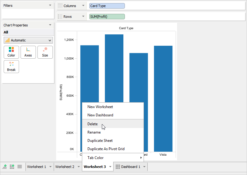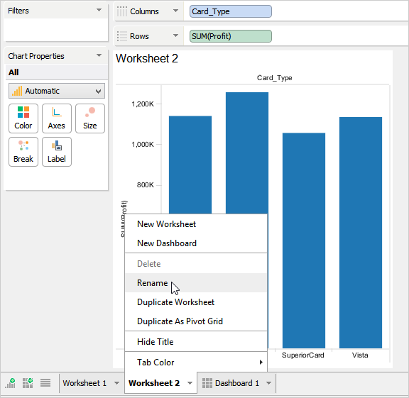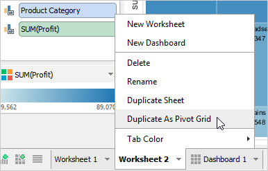 To duplicate an existing Worksheet or Dashboard, left click its tab and select [Duplicate Worksheet]. This is useful for making a copy of your work so you can make modifications on existing views without altering the original content.