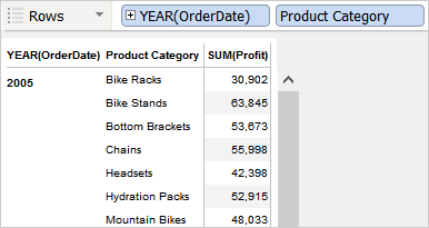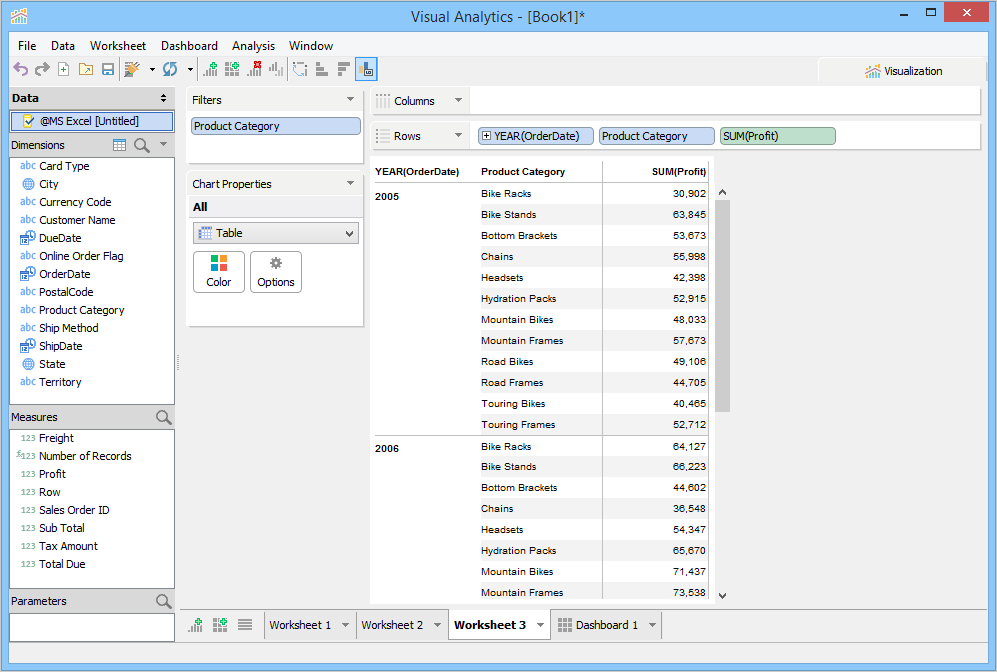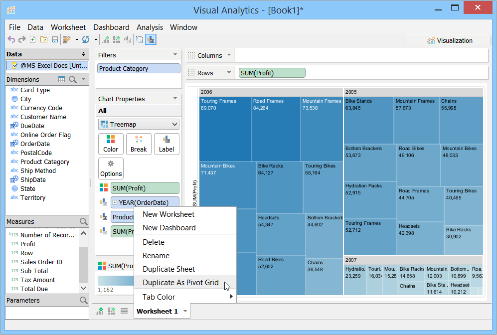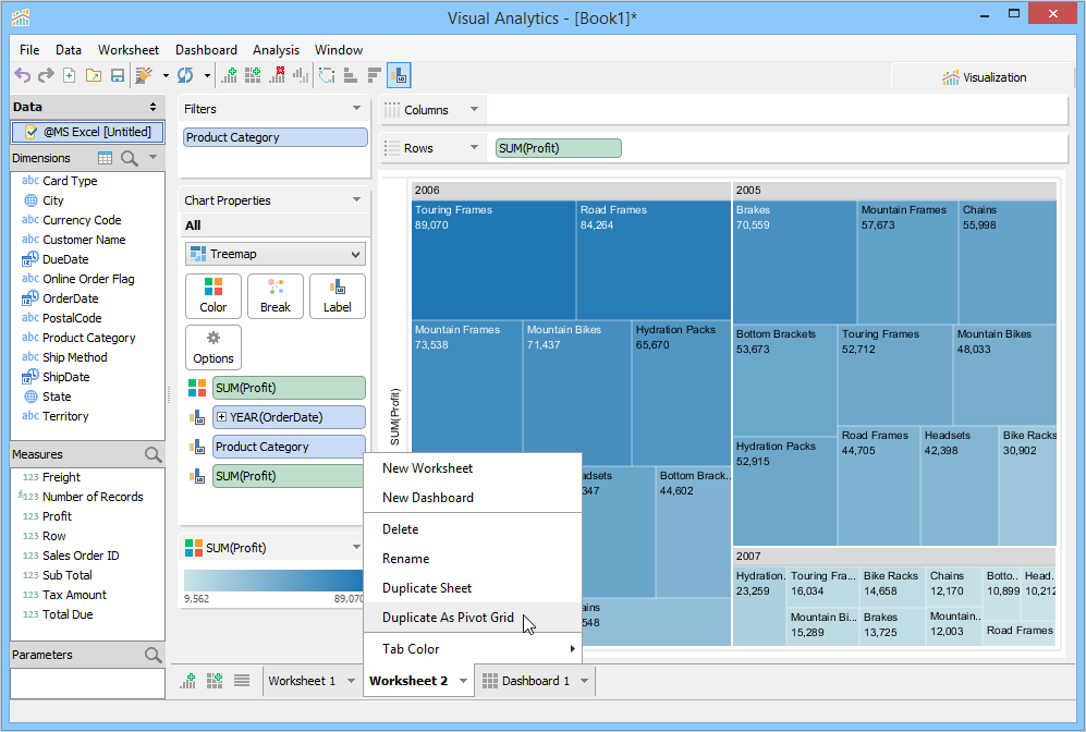 To create a pivot grid view, Visual Analytics moves the dimensions or measures from the Chart Properties Deck to the Rows or Columns Deck. You can duplicate a chart as a pivot grid by right-clicking the Worksheet Tab, or by clicking the Worksheet menu > Duplicate As Pivot Grid.