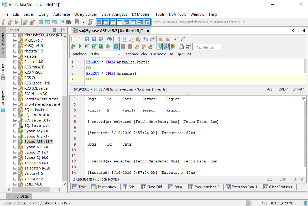 Explain Plan for Sybase 12.5, 15.x and 16.x When executing a query, it’s possible to view Execution Plan for Sybase 12.5, Sybase 15.x and Sybase 16.x as TEXT or XML based on the type selected in File > Options > Visual Explain > Sybase ASE Visual Explain Plan. Explain Plans are available by executing an explain by clicking the "Execute Explain Plan" button in the Query Analyzer toolbar, and by enabling "Show Execution Plan" for Results in the Main Application Toolbar when running a query in a regular fashion. TEXT Explain The TEXT Explain option displays a text formatted version of the explain plan, with an associated Explain grid underneath it. There are columns within the grid for Total Logical Reads, Total Physical Reads, Scan Count, Regular Reads Logical, APF Reads Logical, Regular Reads Physical, APF Reads Physical, and APF IOs. The query will not be executed when the "Execute Explain" button is used. XML Explain With the XML Explain option selected, the Explain Plan displays a diagram that allows clicking nodes to view details for those nodes in the Details tab. Mouse hover over nodes also produces a tool-tip containing statistics for that node. The query will be executed when the "Execute Explain" button is used. Important: Keep in mind that executing an explain in the XML Explain mode on an INSERT, UPDATE or DELETE statement will affect your data. The Details tab displays information about the currently selected node in the Diagram, including information on: